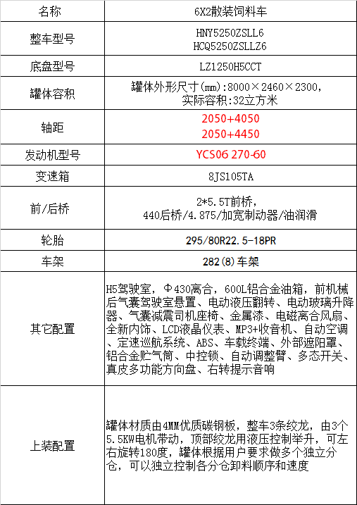 發(fā)動機YCS06 270-60,8JS105TA,Ф430離合,282(8)車架,600L鋁合金油箱,295/80R22.5,前機械后氣囊駕駛室懸置、電動液壓翻轉(zhuǎn)、電動玻璃升降器、氣囊減震司機座椅、全新內(nèi)飾、自動空調(diào)、定速巡航系統(tǒng)、ABS、車載終端、外部遮陽罩、鋁合金貯氣筒、中控鎖、多態(tài)開關(guān)、真皮多功能方向盤、右轉(zhuǎn)提示音響